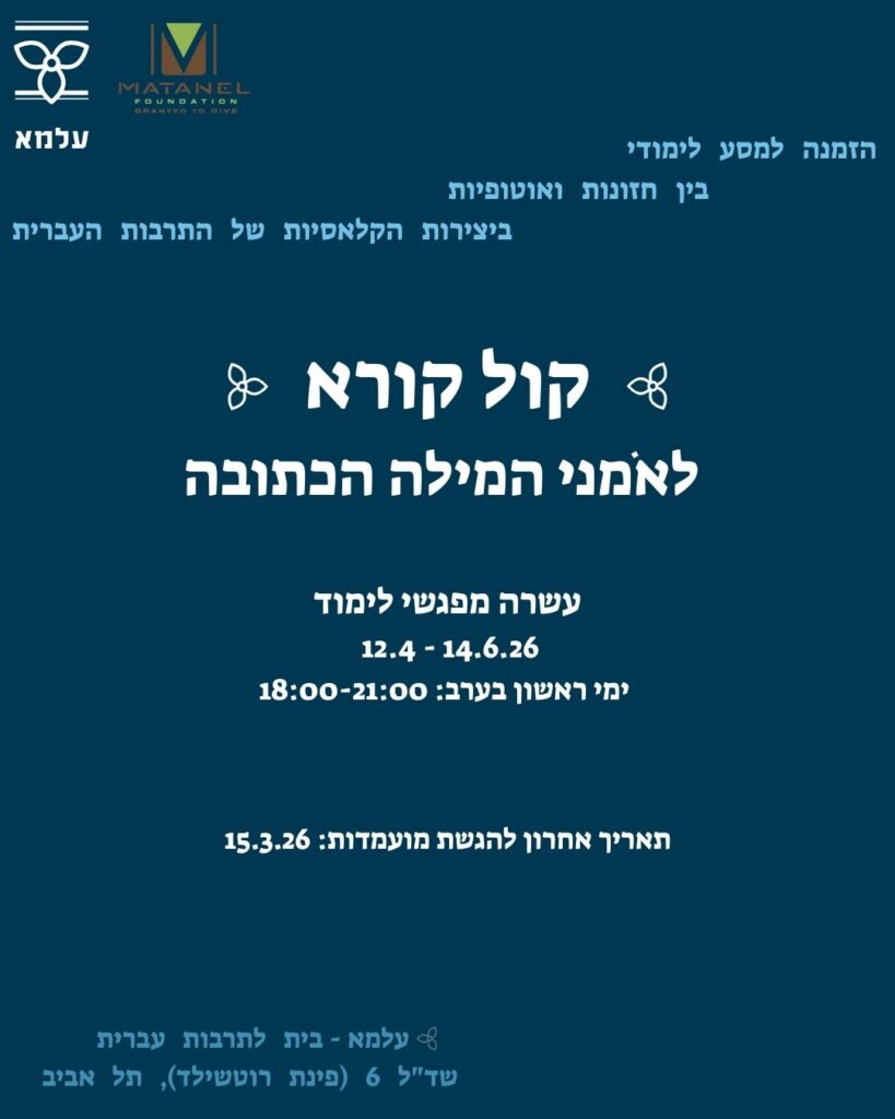 עלמא מזמינה כותבים וכותבות – משוררים, מתרגמות, עורכות, אוצרים, מחזאים, סופרות ועוד, לעשרה מפגשי לימוד בנושא חזון ואוטופיות. יחד נצא למסע טקסטואלי ספרותי באוצרות התרבות העברית בין חזונות, פנטזיות...